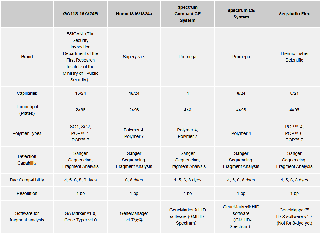 Regarding instrument advances, genetic analyzers with 8-dye and higher detection capabilities are progressively developing (Table 1). Instruments currently supporting 8-dye STR detection include domestic brands GA118-24B and Honor 1816/1824, as well as imported brands Spectrum CE System and Spectrum Compact CE System. Among these, the Seqstudio Flex Genetic Analyzer requires the manufacturer to provide a specific 8-dye fluorescent spectral calibration dye set definition file to support 8-dye detection. Notably, domestic equipment continues to make breakthroughs in the Multidye domain; literature has confirmed the GA118-24B’s potential for 9-dye detection. Suyuan Gene showcased its constructed 10-dye Matrix system at the 12th China International Police Expo in 2025 and announced that a supporting 10-dye STR kit will soon be launched. In terms of loading efficiency, the Spectrum CE System and Seqstudio Flex significantly enhance convenience with designs accommodating continuous runs of four 96-well plates. Regarding software support, apart from GeneMapper™ ID-X v1.7 currently used with SeqStudio Flex, which does not yet support 8-dye data analysis, other brands have dedicated DNA analysis software for processing 8-dye data.