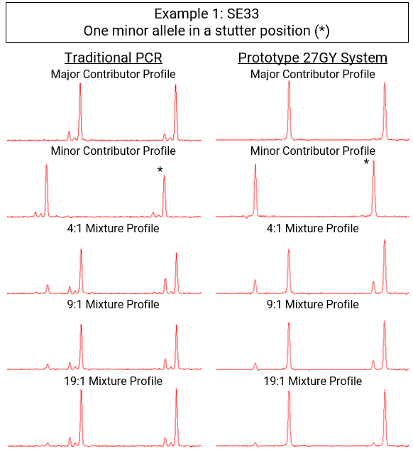Figure 1 shows how the reduced stutter polymerase (right) eliminates the confounding stutter artifacts found in the data from traditional PCR (left) at the SE33 locus.