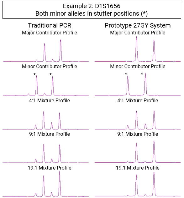 Figure 2 shows how the reduced stutter polymerase (right) eliminates the confounding stutter artifacts found in the data from traditional PCR (left) at the D1S1656 locus.